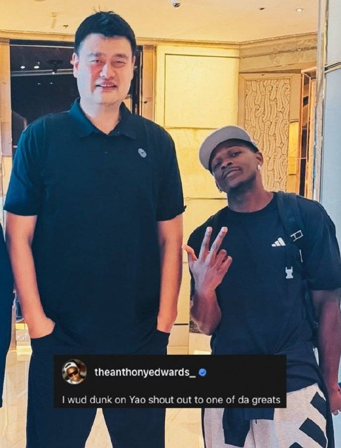 爱德华兹合影姚明 配文:我要隔扣他以此致敬