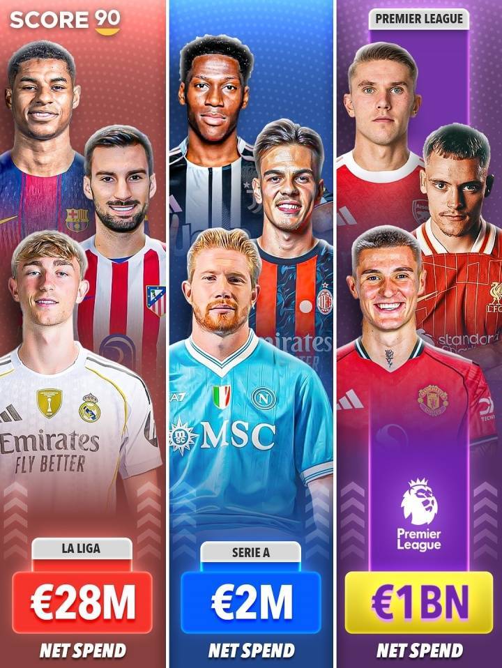 4大联赛夏窗净投入:英超10亿欧 西甲2800万意甲200万 德甲-1.4亿